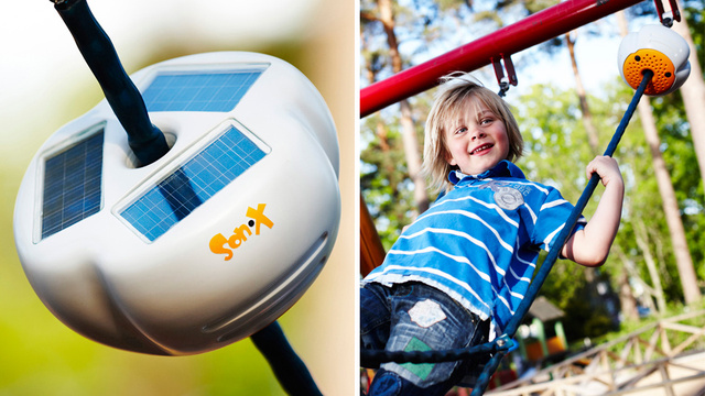 Son-X, который в настоящее время поставляется школам в Европе, является беспроводным и работает на солнечных батареях, его легко установить на любом игровом комплексе. Когда ребенок на качелях достигает определенной высоты, оно играет аплодисменты, чтобы поощрить его продолжать игру.
