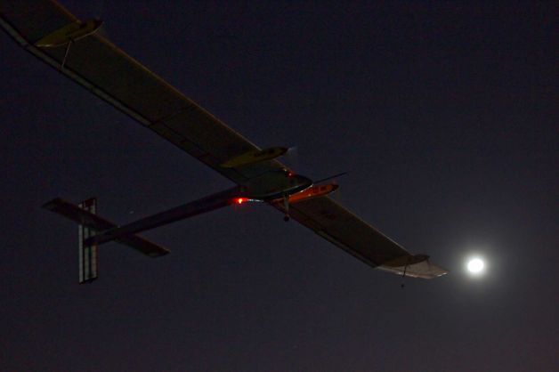 Солнечные батареи этого из угле волокна созданного самолёта днём не только крутят двигатели, но и заряжают 400 килограммовый литий-полимерный аккумулятор ,чтобы самолёт мог лететь когда стемнеет.